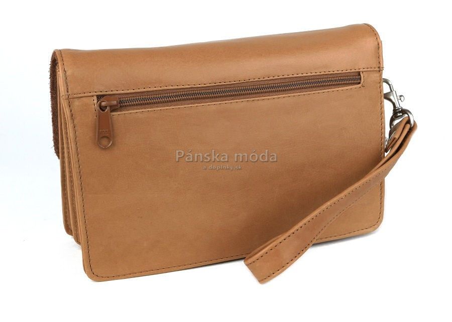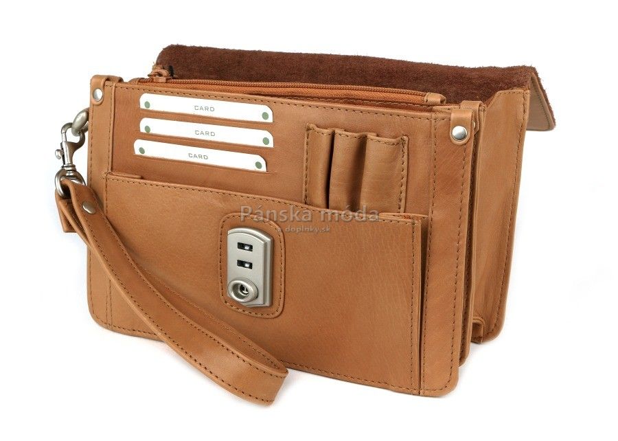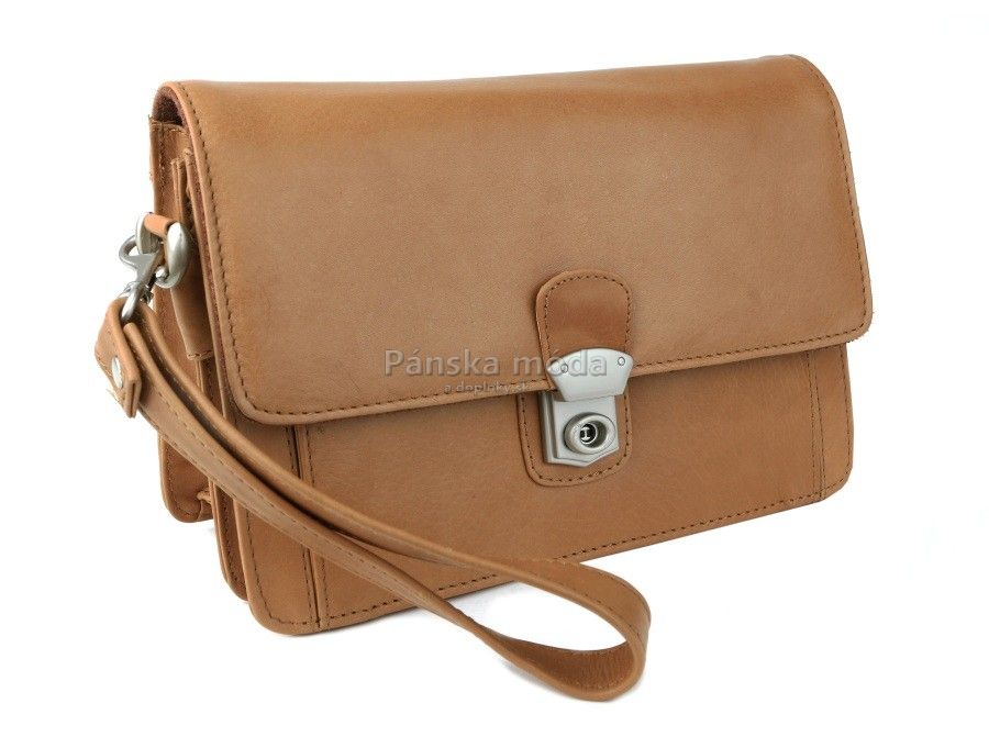 Kožená pánska príručná taška na doklady a osobné veci s úchytom za bočnú rúčku (odnímateľná na karabínke). Praktické vnútorné členenie, predná časť s kartovými priehradkami. Vyrobená z mäkkej kože s matnou úpravou povrchu. Najviac namáhaná vnútorná spodná časť poklopu kombinovaná s brúsenou kožou.